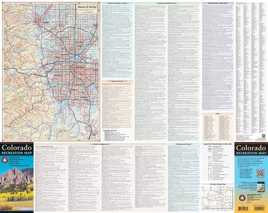 The Colorado Recreation Map is a folded map version of the Recreation Guide pages within Benchmark Maps' Colorado Road & Recreation Atlas. One side provides a full state map that features Public Lands, extensive highway detail, point-to-point mileages, recreation attractions, campgrounds, parks and wildlife areas, fishing access points, and hunting units (GMU). The reverse side includes a Denver vicinity map and categorized recreation listings with helpful descriptions, current contact information, and map grid references.