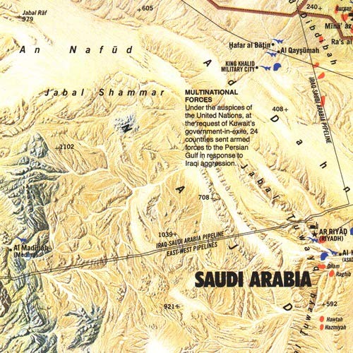 In August 1990 the Middle East's cauldron once again boiled over when Iraq invaded Kuwait, its wealthy and much smaller neighbor. Iraq claimed to be asserting due sovereignty from days of the Ottoman Empire, but the real motives seemed otherwise. Published in February 1991 during the Gulf War, this map accompanied a political map of the Middle East.