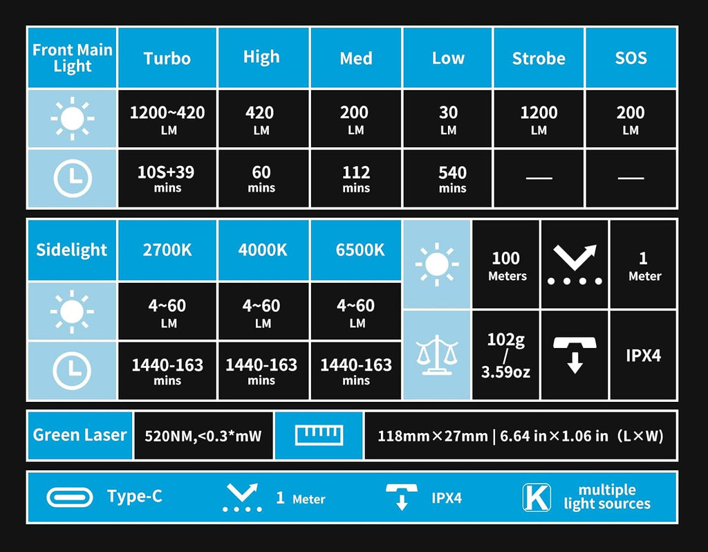 [4-in-1 Multi-Light EDC Flashlight]: Combining white, warm, neutral white, and green beams, this flashlights provide up to 1600 lumens of maximum brightness, suitable for various occasions.