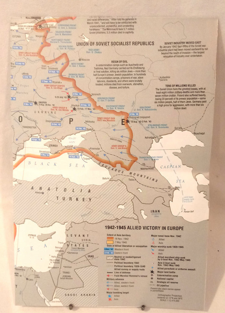 This World War II map plus the map on the other side is the must have map set for those interested in World War II. This map is filled with inset maps, pictures and informative notes on the war. On the bottom section is a large highly detailed physical map of Europe and North Africa. On it you will find marked the extent of Axis territory as of 18 Nov. 1942 and 7 May 1945, major naval bases Nov. 1942, locations of where major warships sunk 1939-1945 and dates and locations of allied liberation or occupation for both the western and eastern front. You will also find locations where merchant ships were sunk by U-boats, major land battles, political boundaries, lines of defense, military advances, major bombing targets and a lot more. Measures 27 inches x 20 inches.