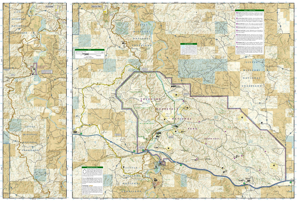 This two-sided map includes both the north and south units of Theodore Roosevelt National Park, as well as the Magpie and Elkhorn section of the Little Missouri Grassland -- providing continuous coverage from north to south. In the North Unit of the park, the map includes the Maah Daah Hey Trail, Little Mo Nature Trail, Caprock Coulee Nature Trail, Buckhorn Trail, Achenbach Trail, and Juniper camping area. The Maah Daah Hey Trail then winds south through the Little Missouri National Grassland, meeting Bennett Trail, then passes into Magpie, then Elkhorn, then into the South Unit of Theodore Roosevelt National Park. Map features in the South Unit include Ridgeline Nature Trail, Coal Vein Nature Trail, Buck Hill Trail, Wind Canyo Trail, Jones Creek Trail, Paddock Creek Trail, Talkington Trail, and the Petrified Forest. Also included in this portion of the map is Buffalo Gap Trail, Roundup Horse Camp, Cottonwood, Painted Canyon, Sully Creek State Park, and the town of Medora. Includes UTM tick marks for use with your GPS unit.
