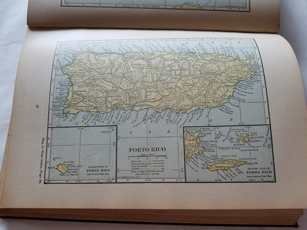 Black cover, undamaged spine, wear on corners. Pages show its age, Wyoming has torn page (see photo) Gazette info on countries, states, etc.